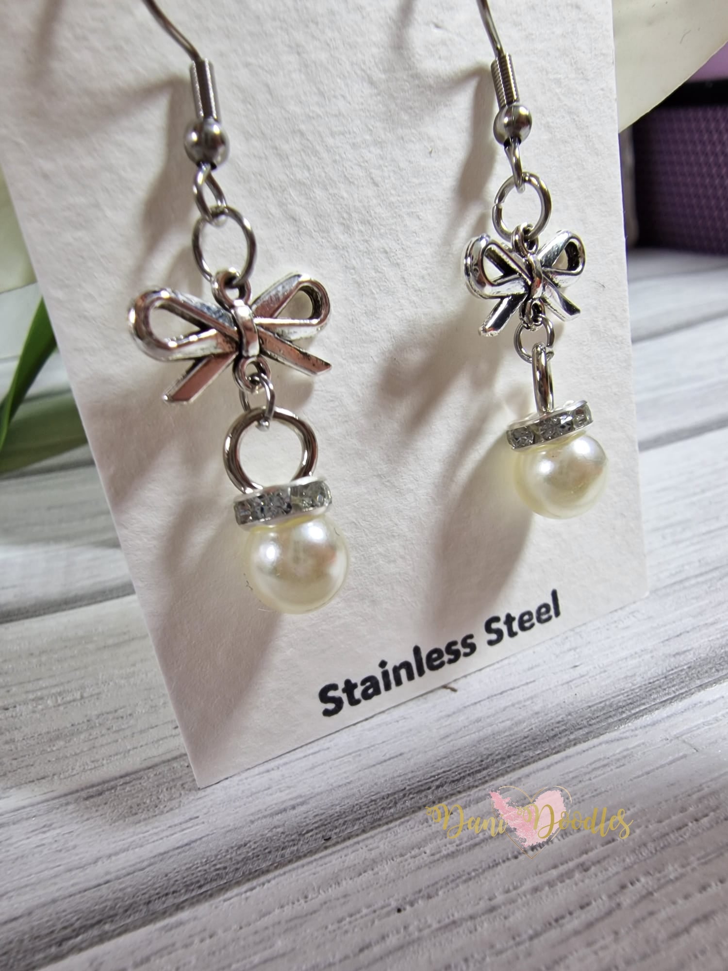 Pretty handmade earrings, featuring an imitation pearl, a pretty bow and sparkles presented on a stainless steel hook.