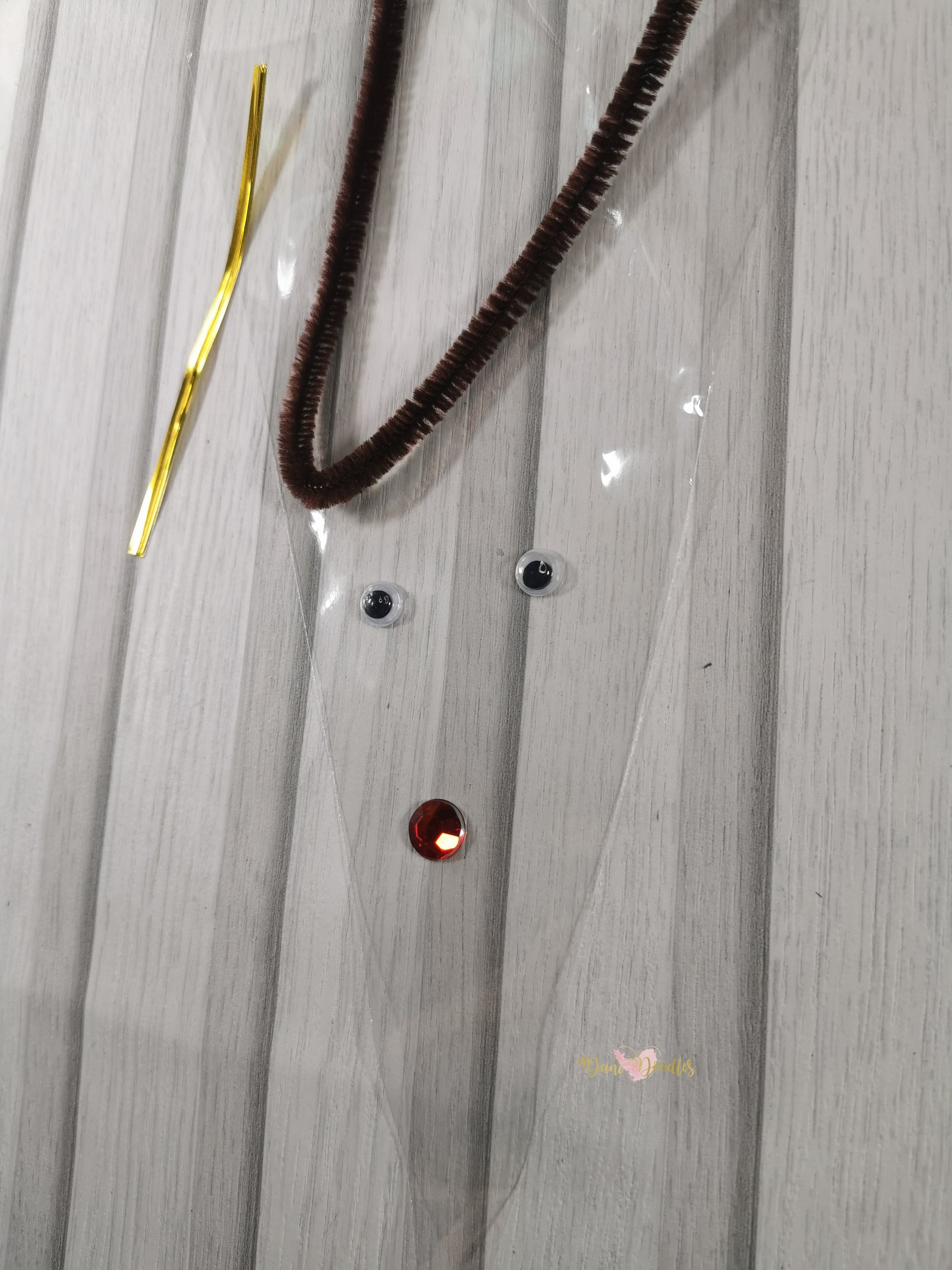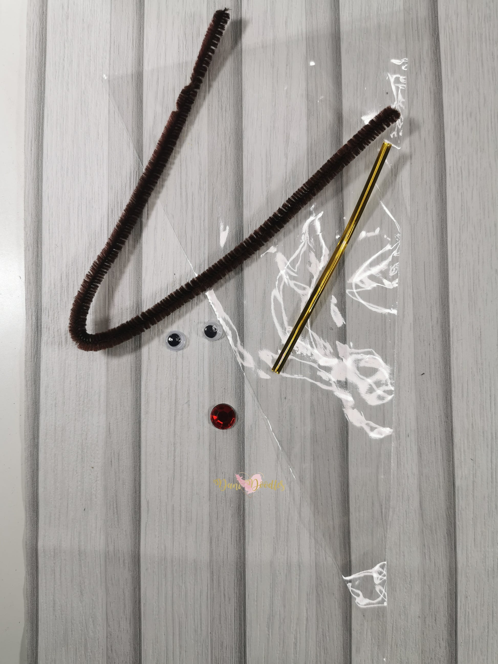 Kit includes: Plastic bag, 2 googly eyes, 1 red sparkly nose, 1 bag seal and 1 chocolate colour pipe cleaner to make the reindeer antlers.